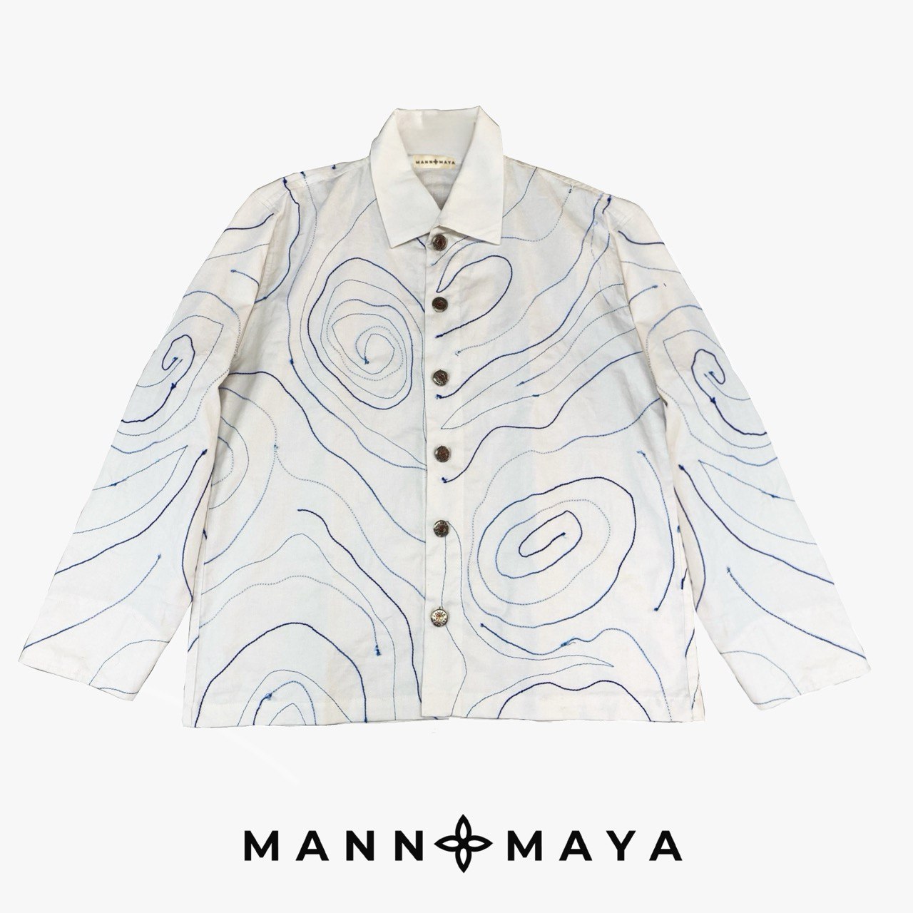 Minimal yet expressive, the Neel Dor Shacket is a canvas of quiet poetry. Crafted in a crisp white cambric base, it features hand-done abstract blue thread embroidery that flows like waves, tracing stories across the fabric.